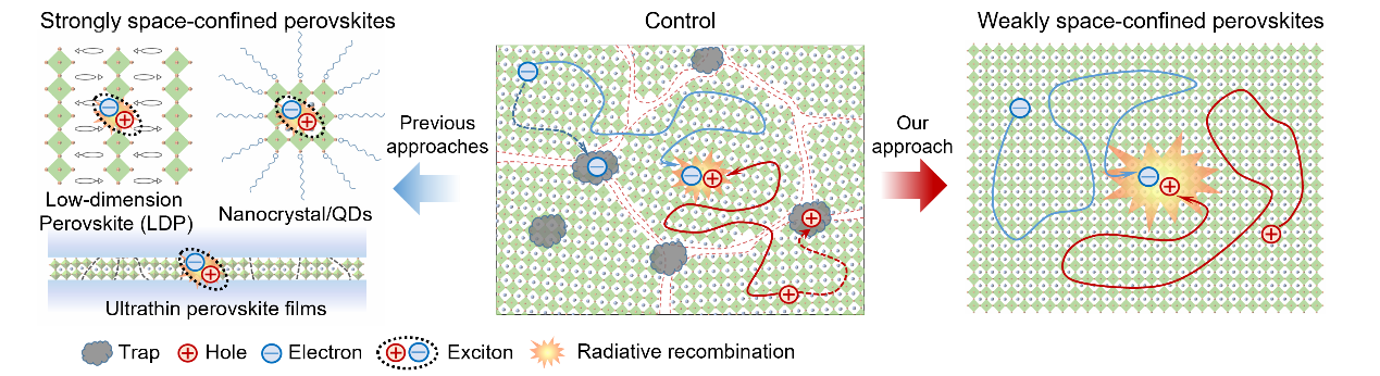 The author highlights his group's research, focusing on developing high-efficiency and stable perovskite light-emitting diodes (PeLEDs), with particular emphasis on exploring a new approach to improve the efficiency and lifetime through a “weak space-confinement” strategy. Although the conventional “strong space-confinement” strategy can improve emission efficiency, it also leads to severe Auger recombination and ion migration, resulting in low brightness and poor device stability of perovskite LEDs. Moreover, the commonly used organic ligands in such systems exhibit poor thermal stability and cannot withstand Joule heating during device operation, thereby limiting the long-term stability. To overcome these challenges, hypophosphorous acid (HPA) and ammonium chloride (NH4Cl) were introduced into the CsPbBr3 precursor system to regulate the crystallization process. This approach yielded highly crystalline perovskite films with large grain size and low grain-boundary density. The weakly space-confined perovskite films show suppressed Auger recombination, reduced ion migration, and enhanced thermal stability. Based on this design, the fabricated green PeLEDs achieved an external quantum efficiency (EQE) of 22%, a maximum brightness of 1.16×106 cd m-2, and an extrapolated lifetime of 1.85×105 hours at 100 cd m-2. These results represent a significant breakthrough in both brightness and stability, providing a promising pathway toward the practical application of perovskite LEDs.